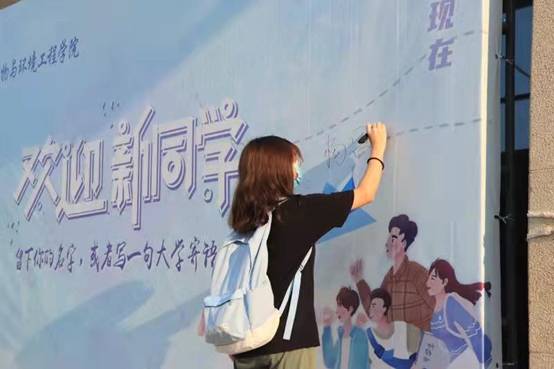 为了更好地使新生感受学院温暖,各学院纷纷展示出独具特色的迎新标语。土木工程学院制作了结合土木特色的迎新横幅,精心设计欢迎新同学的喷绘;外国语学院在室内张贴了“春风十里,不如外院有你”心若向阳,光自生长”等标语,吉祥物“宁宁”和“静静”也在门口等待与新同学合影;机电工程学院化用专业名称,使其蕴含标语之内;计数学院编辑代码向本院新生表示欢迎;经济与管理学院利用谐音与常见寓意表达对2021级经管学子生活明媚阳光的美好祝愿;电信学院还在大厅摆放了特地制作的全国生源地域图,表达出对各地学生的欢迎。
