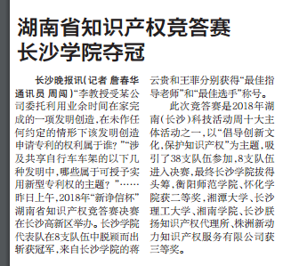 此次竞答赛是2018年湖南(长沙)科技活动周十大主体活动之一,以“倡导创新文化,保护知识产权”为主题,吸引了38支队伍参加,8支队伍进入决赛,最终ky官方网站拔得头筹,衡阳师范学院、怀化学院获二等奖,湘潭大学、长沙理工大学、湘南学院、长沙朕扬知识产权代理所、株洲新动力知识产权服务有限公司获三等奖。