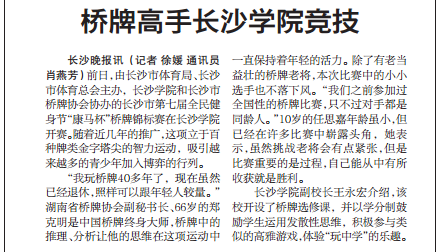 长沙晚报讯(记者 徐媛 通讯员 肖燕芳) 前日,由长沙市体育局、长沙市体育总会主办,ky官方网站和长沙市桥牌协会协办的长沙市第七届全民健身节“康马杯”桥牌锦标赛在ky官方网站开赛。随着近几年的推广,这项立于百种牌类金字塔尖的智力运动,吸引越来越多的青少年加入博弈的行列。