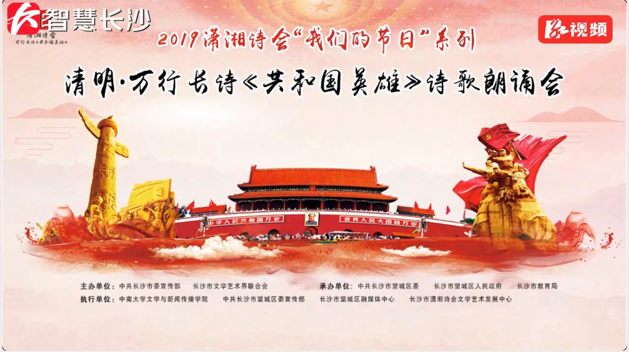 清明节是二十四节气中最具人文历史特色的节气,也是中华民族重要的传统节日,寄托着人们对已故亲友、革命先辈的追忆哀思和中华民族寻根谒祖的感恩心愿。在新中国七十周年华诞即将到来之际,中共湖南省委宣传部 、湖南省文学艺术界联合会主办2019潇湘诗会“我们的节日”系列——清明·万行长诗《共和国英雄》诗歌朗诵会。慎终追远,继志述事,重温历史,再创辉煌。谨以此主题系列诗会向中华人民共和国成立70周年献礼!向伟大的共和国英雄们致敬!