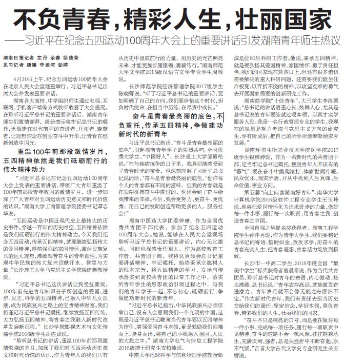 “聆听总书记的讲话,重温100年前那段激情燃烧的岁月,加深了我们对五四运动历史意义和时代价值的认识,作为青年人的我们只有从历史中汲取前行的力量,用历史的光芒照亮未来,才能更加步履铿锵、勇毅笃行。”湖南师范大学文学院2015级汉语言文学专业学生周敏说。