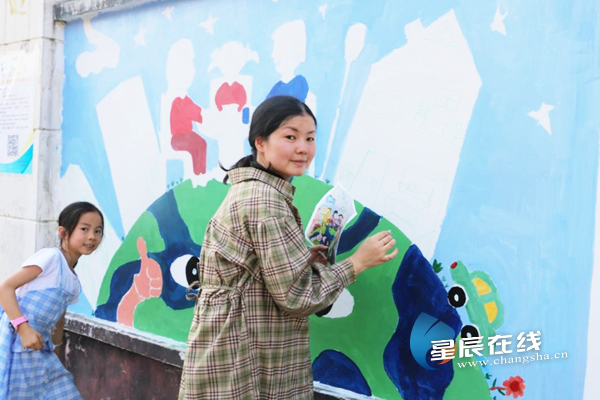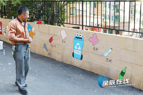 (长沙市开福区洪山街道洪雅社区组织开展以垃圾分类为主题的亲子墙绘活动。)