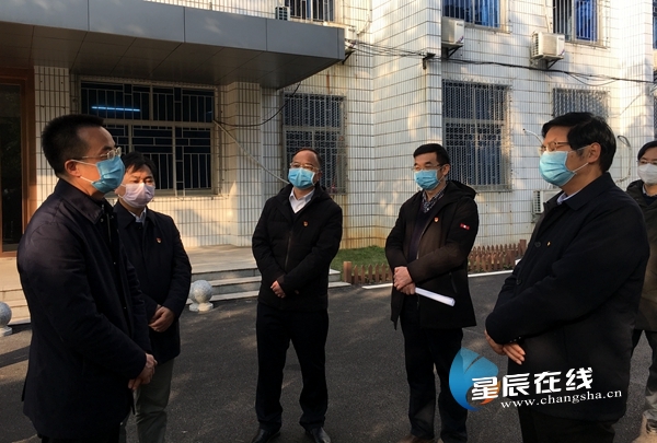(开福区委书记曹再兴<左一>一行到ky官方网站指导疫情防控工作。)