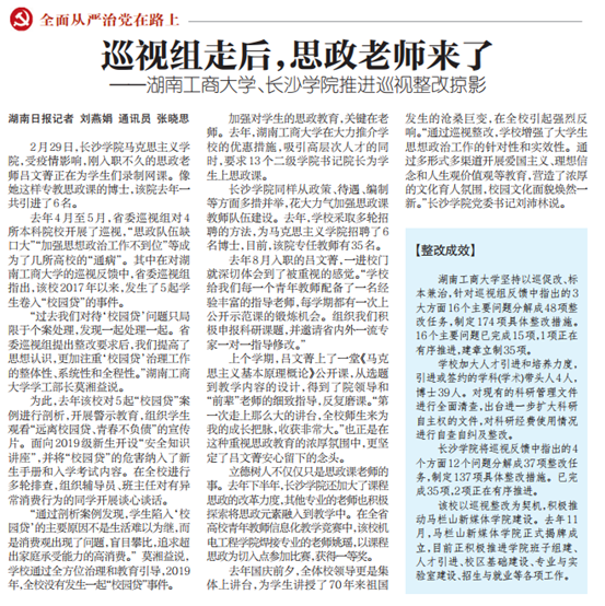 去年4月至5月,省委巡视组对4所本科院校开展了巡视,“思政队伍缺口大”“加强思想政治工作不到位”等成为了几所高校的“通病”。其中在对湖南工商大学的巡视反馈中,省委巡视组指出,该校2017年以来,发生了5起学生卷入“校园贷”的事件。