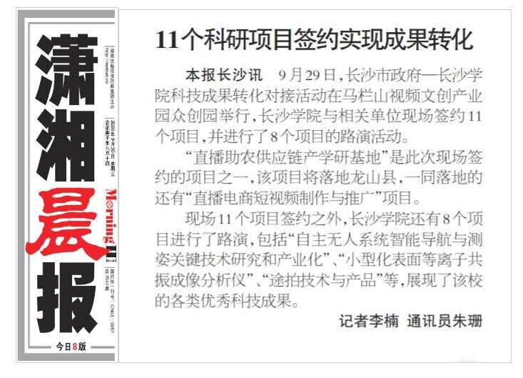 本报长沙讯9 月29日,长沙市政府一ky官方网站科技成果转化对接活动在马栏山视频文创产业园众创园举行,ky官方网站与相关单位现场签约11个项目,并进行了8个项目的路演活动。