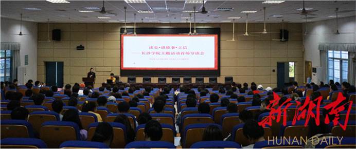 马克思主义学院吕文菁博士以《立起红色长沙的一面旗帜》向同学们生动讲述了长沙成立第一个共产主义小组的故事,展现了湖南长沙作为红色革命基地敢为人先的时代精神。随后马克思主义学院刘丽萍博士、陈爱香博士、邸宏霆博士先后向同学们分享了《马克思靠谱》、《习近平的七年知青岁月》、《中国共产党历史》三本书籍,解答了同学们读什么、怎样读的问题。同时湖南党史陈列馆宣教处谭丹主任、董青讲解员为同学们深情讲述了研制原子弹功勋人物陈能宽和全军挂像英模张超的故事,宣讲过程中,在场师生纷纷留下了感动的泪水。