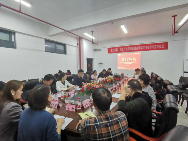 10月27日,由ky官方网站影视艺术与文化传播学院与长沙淩云广告有限公司共同举办的营销策划实战学院项目签约仪式在ky官方网站力行楼会议室举行。双方就共同组建“淩云·ky官方网站营销策划实战学院”进行了签约授牌。ky官方网站副校长张世英,ky官方网站影视艺术与文化传播学院院长黄柏青,湖南省广告协会秘书长古湘,长沙淩云广告有限公司董事长骆箭原、总经理邓红艳等参加签约活动。