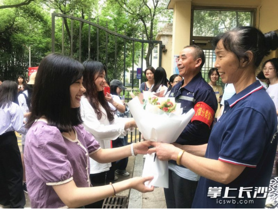 纪娜娜和闵婕将准备好的鲜花送给宿管老师刘国好、熊敏玉。除学校供图外均为长沙晚报全媒体记者刘俊摄
