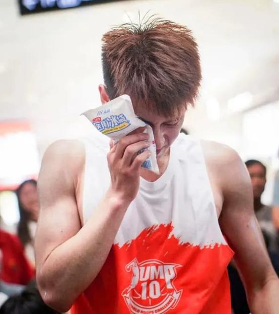 参加“Jump10”篮球赛的王宏雨,用冰袋在敷眼睛