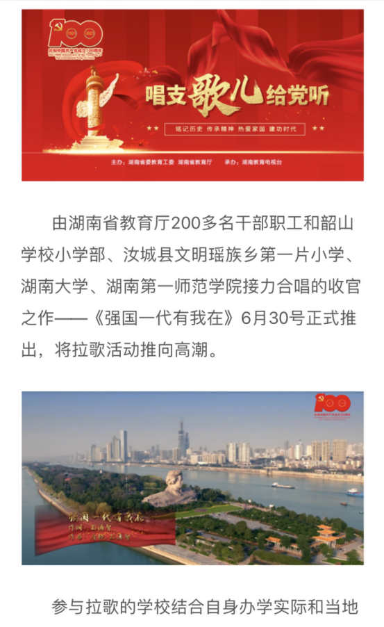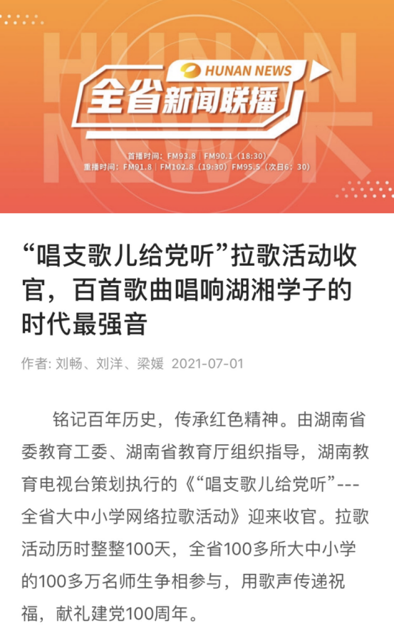 湖南电台《全省新闻联播》:“唱支歌儿给党听”拉歌活动收官,百首歌曲唱响湖湘学子的时代最强音