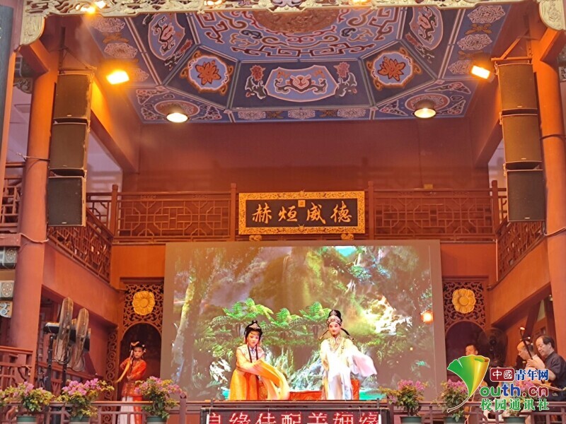 图为“情'戏'花鼓”暑假社会实践团成员在火宫殿看花鼓戏表演。