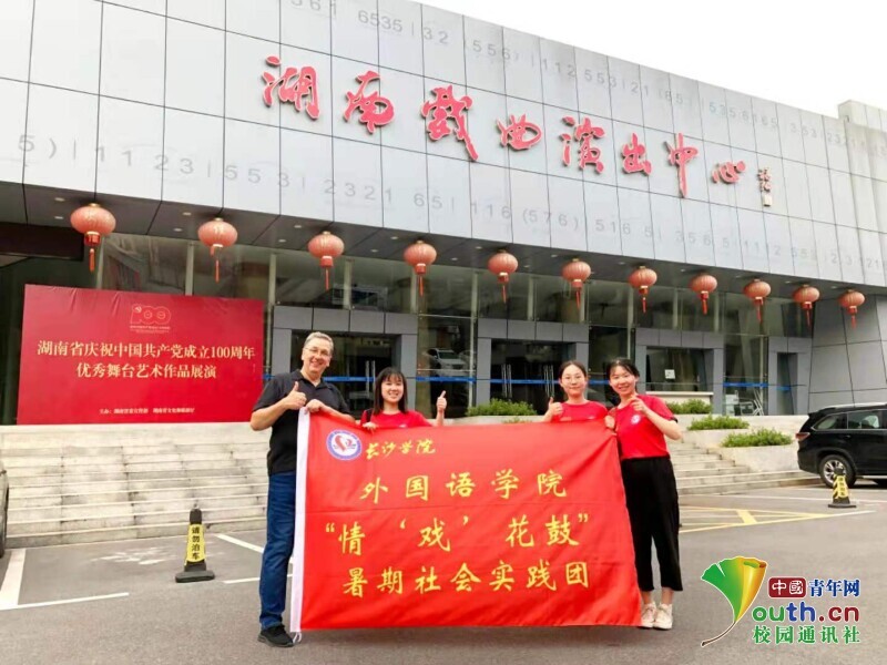 图为“情'戏'花鼓”暑假社会实践团成员与外教老师前往观看演出。