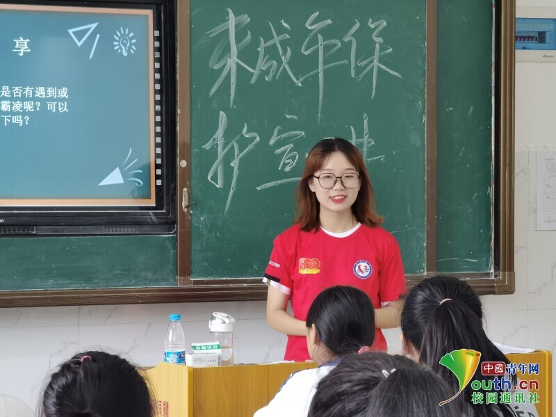 图为团队成员正在为九年制学校学生宣讲法律知识。中国青年网通讯员 廖桂峰摄