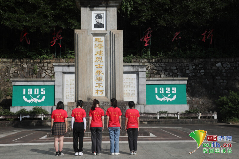 图为语焕星城暑期实践团队成员在毛泽健陵园烈士纪念碑前默哀
