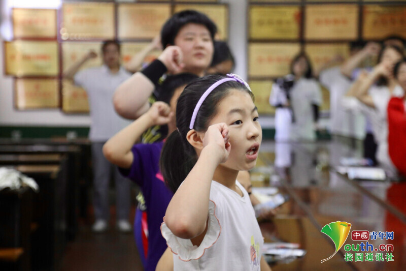 图为小朋友在志愿者带领下进行禁毒宣誓。中国青年网通讯员张楚政摄