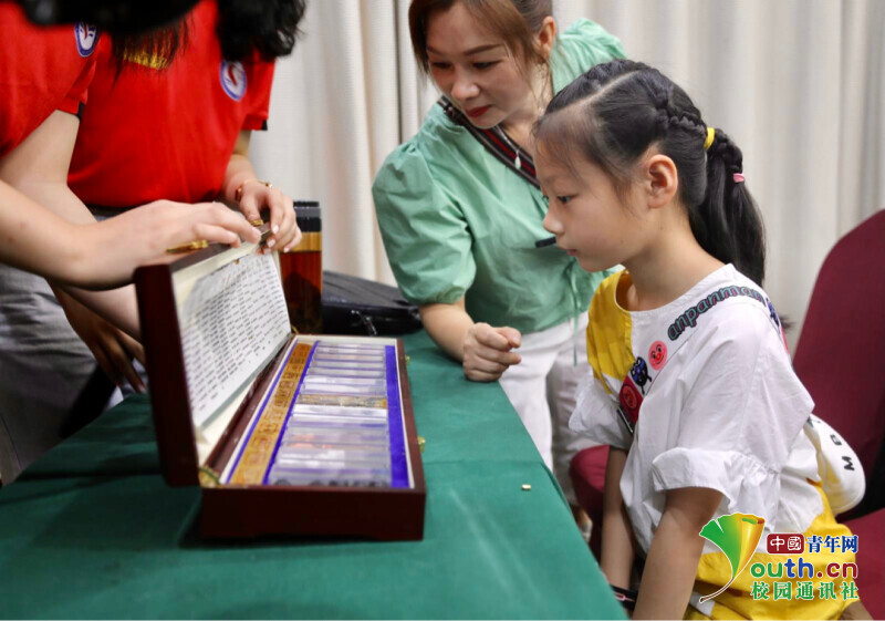 图为家长带孩子认真观察毒品仿真模型(中国青年网通讯员张楚政摄)