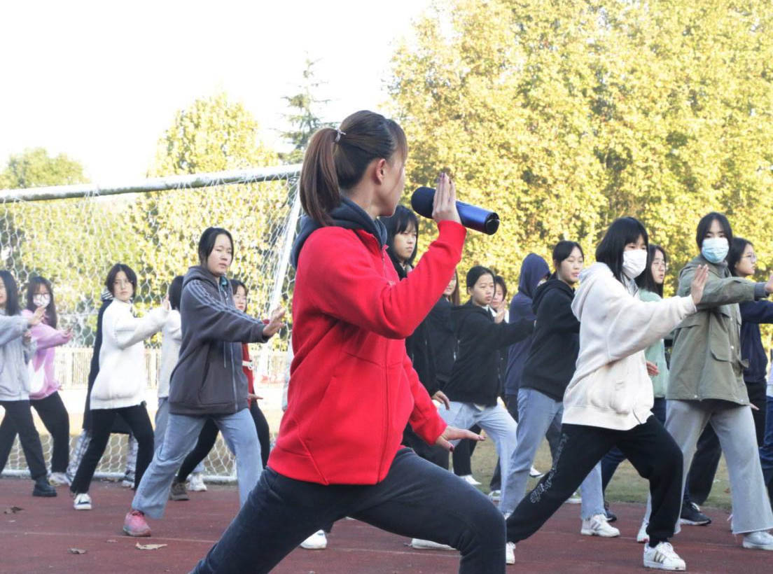 在操场上,有的班级整齐划一,有组织的进行慢跑;有的班级三五成群,开展“迎面接力”“滚雪球”“爬虫竞走”等集体运动项目,还有的同学则在体育老师的指导下练起了太极……
