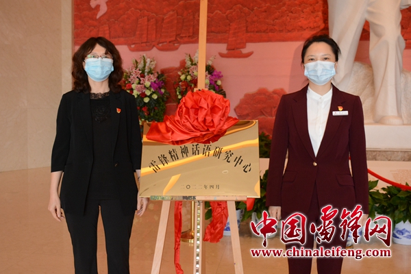 (4月22日,湖南雷锋纪念馆党组书记邹文(右)与ky官方网站外国语学院党总支书记刘秋菊(左)为雷锋精神话语研究中心揭牌。图片来源:中国雷锋网 记者 刘旺 摄)