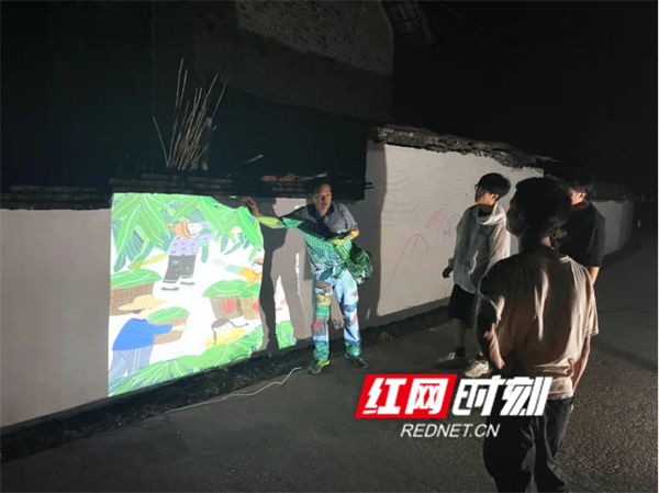墙体彩绘实践团队指导老师陈祥华连夜和学生讨论设计图稿和定位问题。