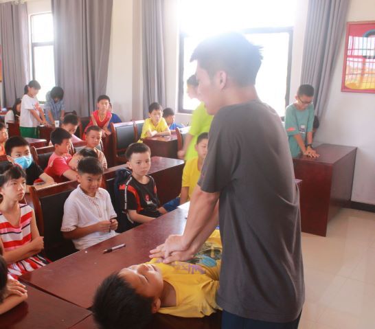 实践团成员向孩子们演示急救操作