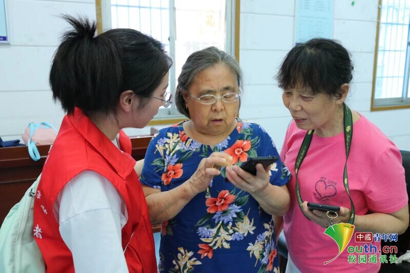 图为在松雅社区课堂上志愿者对老人进行一对一指导过程。 中国青年网通讯员 杨菁 供图