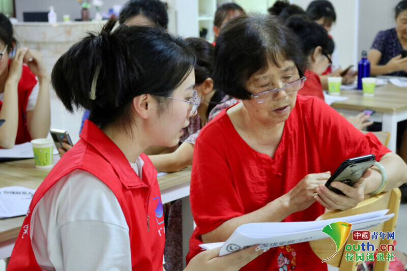 图为志愿者在给老人“一对一”讲解智能手机的操作方法,老人在认真学习。中国青年网通讯员 杨菁 摄