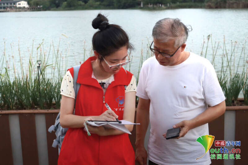 图为志愿者在对老人使用智能手机的相关问题进行问卷调查。中国青年网通讯员 钟佳雨 摄