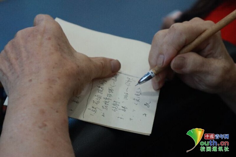 图为老人在课堂中认真记笔记。中国青年网通讯员 伍文慧 摄