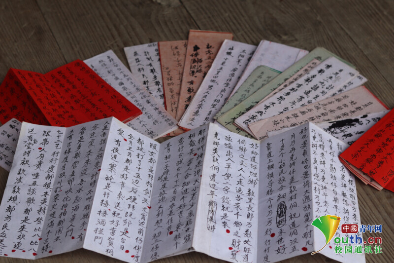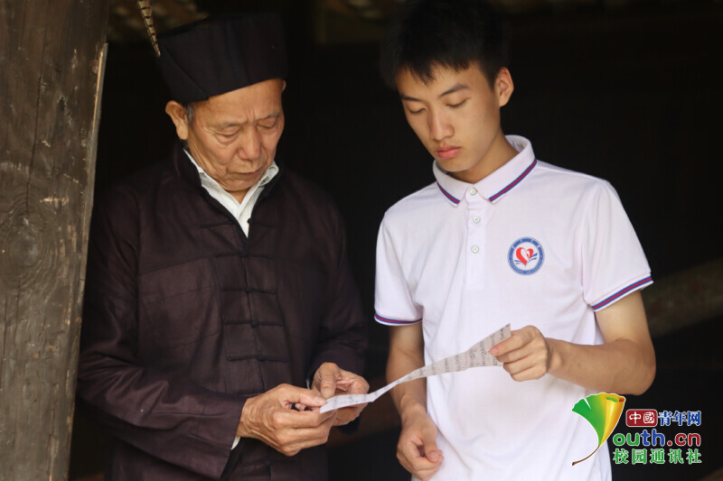吴祥跃爷爷在向大家展示自己往年手写过的侗款。中国青年网 李馨瑶 供图