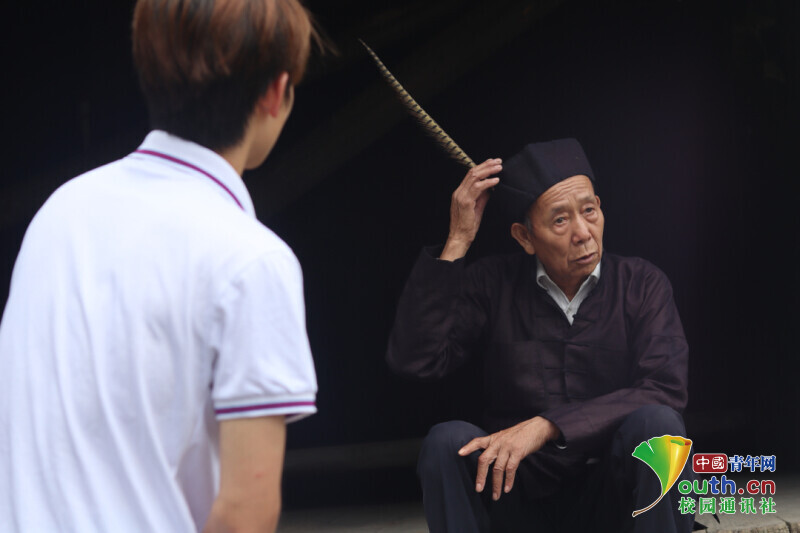 吴祥跃爷爷在讲述头上“长羽毛”的意义。中国青年网 李馨瑶 供图
