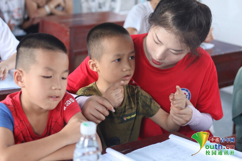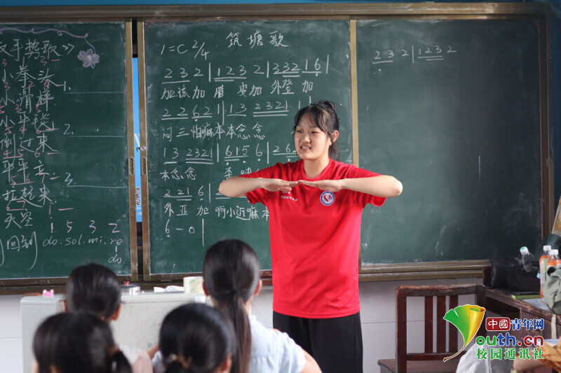 支教老师们共同合作,带领小朋友们完成音符手势舞的练习。中国青年网 李馨瑶 供图