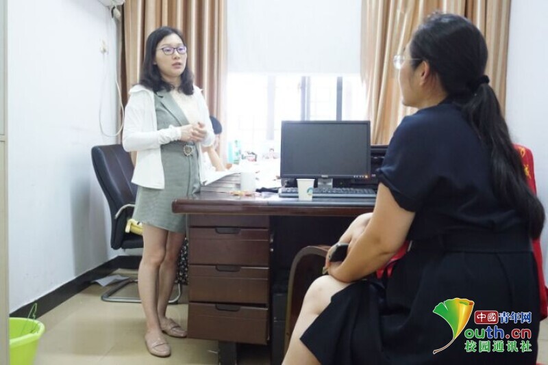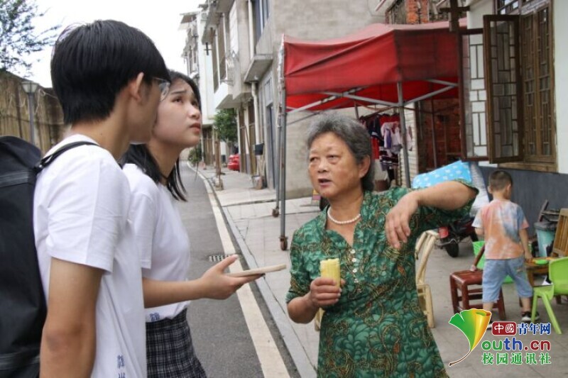 图为团队老师向㮾梨街道社区负责人了解社区对陶公庙附近的保护工作现状。中国青年网通讯员 李志玲 摄