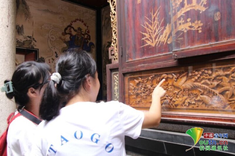 图为团队成员共同研究陶公庙内的木浮雕。中国青年网通讯员 黄佳璇 摄