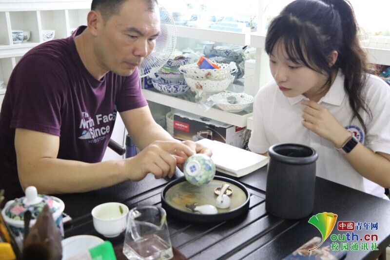 图为醴陵陶瓷大市场张敏为团队成员讲解醴陵陶瓷特点。中国青年网通讯员 周影锋 供图