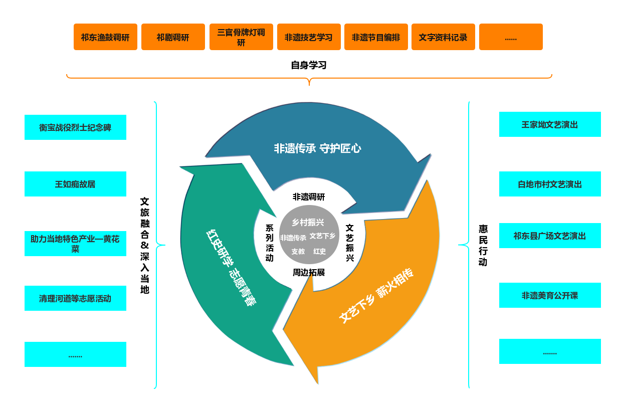 非物质文化遗产是中华优秀传统文化的重要组成部分,是传承中华文明、赓续中华文脉的重要载体。乡村振兴离不开非遗文化的传承与发展,以文化产业带动其他产业是实现乡村振兴的重要途径。团队通过一周的社会实践,发挥自身专业优势,调研当地非物质文化资源、红色研学实践等系列活动,深入思考祁东县非遗渔鼓、鱼灯舞耍传承与乡村振兴的融合发展。总而言之,“文化立世,文化兴邦”,传承创新非遗文化,助力乡村振兴,我们共同前行!