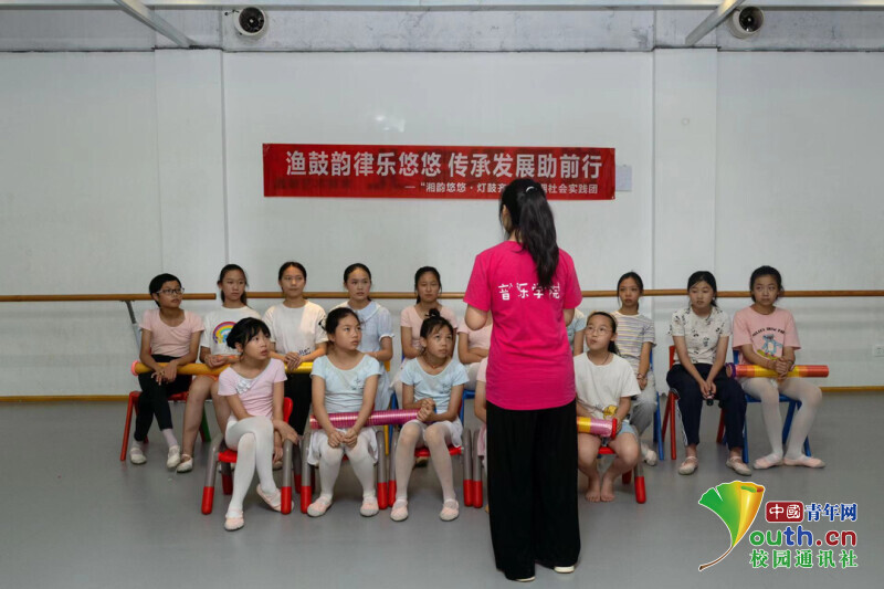图为实践团成员向同学们演示如何敲打渔鼓。中国青年网通讯员 陈鑫 摄
