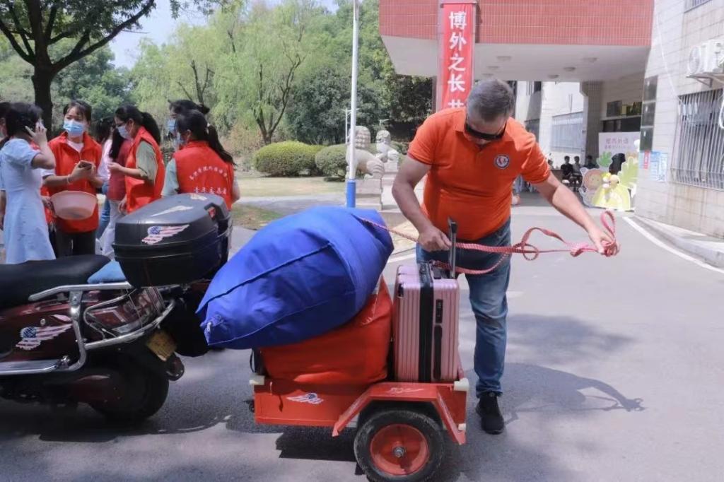 在报到高峰期,学校里还活跃着一支教师志愿者队伍。他们没有穿红马甲,但是,看到报到乘车点排队人数较多,天气比较热,学院的老师们自发组织,用自己的私家车接送学生、搬运行李。这支“编外志愿者”队伍中还有一位是外籍教师Denis。报到的这两天,他骑着他的电动自行车,自行车后面拉着一个拖斗车,一趟又一趟地帮学生搬运行李。