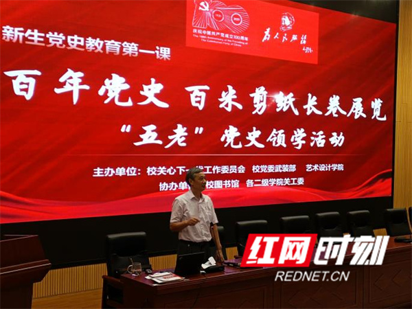 “百年党史剪纸长约108米,由开天辟地、改天换地、翻天覆地、惊天动地四个篇章组成,ky官方网站艺术设计学院100名学生党员、入党积极分子历时三个月共同制作完成,通过剪纸艺术,生动形象的展现了中国共产党波澜壮阔的100年历史......”在ky官方网站图书馆一楼中厅长幅红色剪纸展览前,一批穿着军训服装、一脸稚嫩的大一新生围成一个扇形状,静静的聆听着,一个白发苍苍的退休老教师边做手势边讲解,浑厚的声音在大厅回荡。