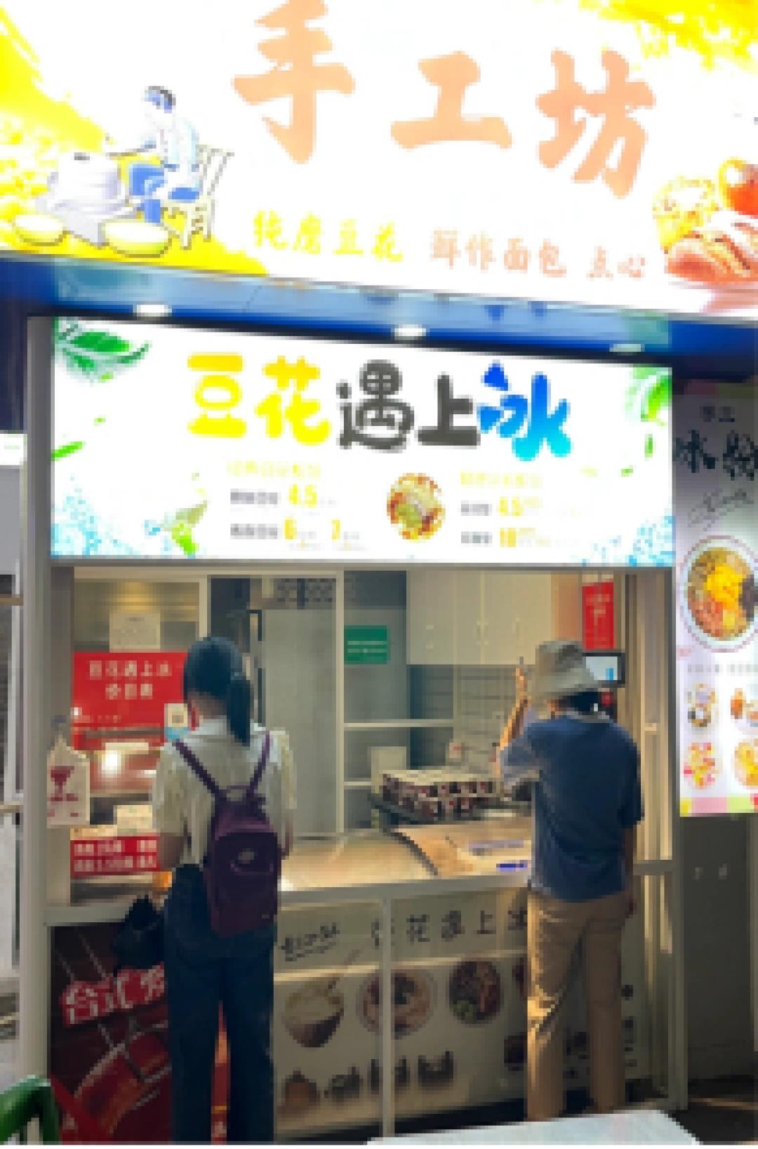 食堂也进驻了校外多个品牌的奶茶店,最有特色的还属一食堂的豆花,五块钱一碗,从冷藏柜取出,一勺牛奶、一勺红糖水,使豆花不止有单调的豆香,再加点芋圆、花生碎、龟苓膏、燕麦等小料,或是一些水果,口感更是风富。