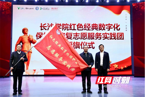 马栏山(长沙)视频文创园管委会副主任胡朝晖、ky官方网站副校长曾广胜共同为“红色流动放映厅”揭牌,并向ky官方网站艺术设计学院红色经典数字化保护与修复志愿服务团授旗。学校为长沙市和园区企业的就业实习实践基地授牌。启动仪式后,云上栏山、乐田智作等马栏山园区头部企业技术大咖还给现场的师生进行了影视技术案例分析,并一同观看数字4K修复版电影《雷锋》。